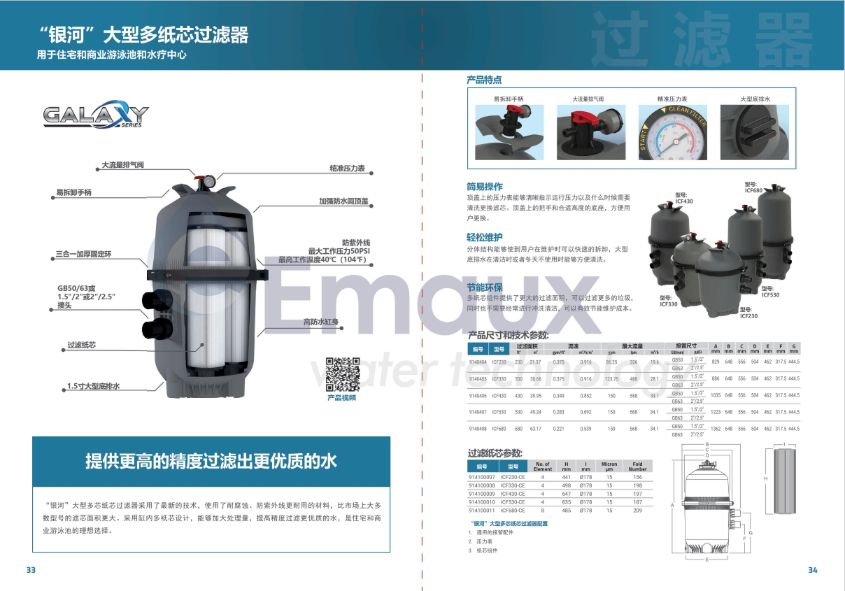 “銀河”大型多芯紙芯過濾器采用了最新的技術(shù),使用了耐腐蝕、防紫外線更耐用的材料,比市場(chǎng)上大多數(shù)型號(hào)的濾芯面積更大。采用缸內(nèi)多紙芯設(shè)計(jì),能夠加大處理量,提高精度過濾更優(yōu)質(zhì)的水,是住宅和商業(yè)游泳池的理想選擇。