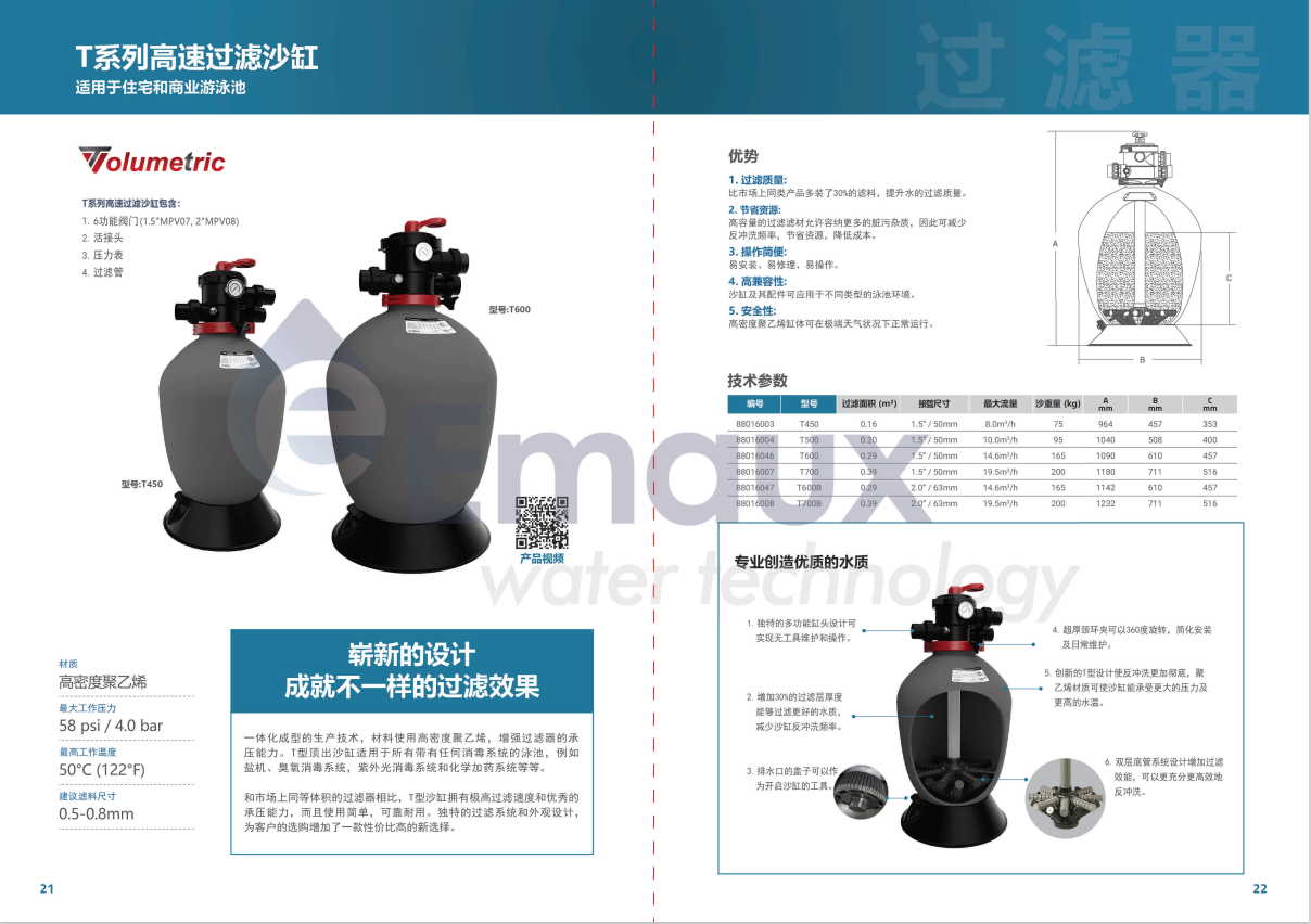 一體化成型的生產技術,材料使用高密度聚乙烯,增強過濾器的承壓能力。T型頂出沙缸適用于所有帶有任何消毒系統(tǒng)的泳池,例如鹽機、臭氧消毒系統(tǒng),紫外光消毒系統(tǒng)和化學加藥系統(tǒng)等等。 和市場上同等體積的過濾器相比,T型沙缸擁有極高過濾速度和優(yōu)秀的承壓能力,而且使用簡單,可靠耐用。獨特的過濾系統(tǒng)和外觀設計,為客戶的選購增加了一款性價比高的新選擇。