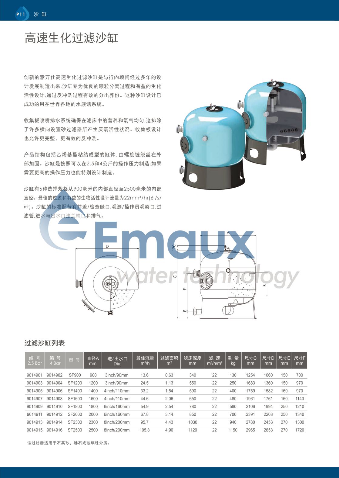 沙缸有6種選擇規(guī)格從900毫米的內(nèi)部直徑至2500毫米的內(nèi)部 直徑。 最佳的過濾和有益的生物活性設(shè)計(jì)流量為22mm3/hr(61/s/ m')。 沙缸的標(biāo)準(zhǔn)配備有井蓋/檢查艙口觀測/操作員觀察口過 濾管進(jìn)水與出水口法蘭端口和排氣。