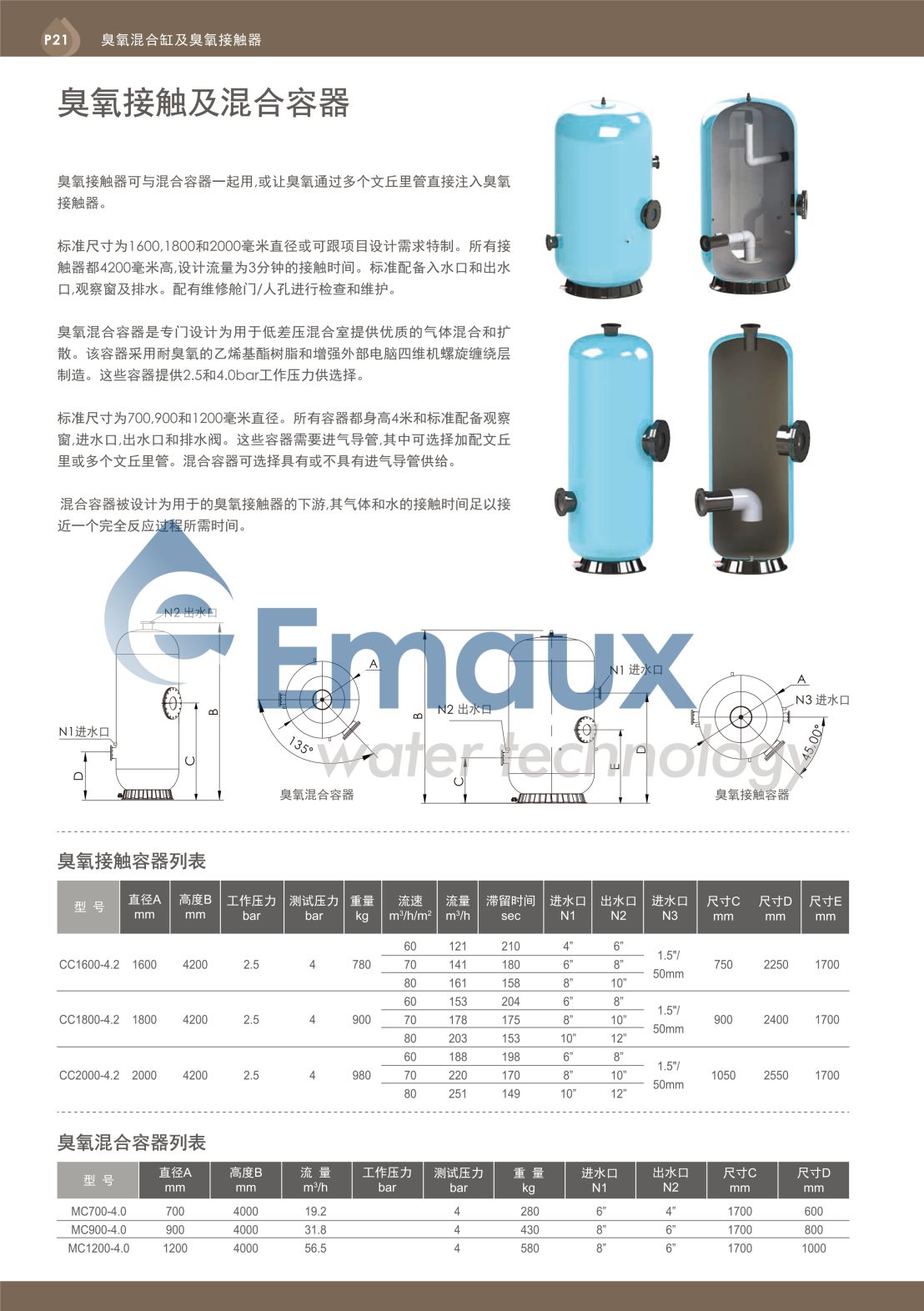 混合容器被設(shè)計(jì)為用千的臭氧接觸器的下游,其氣體和水的接觸時間足以接近一個完全反應(yīng)過程所需時間。