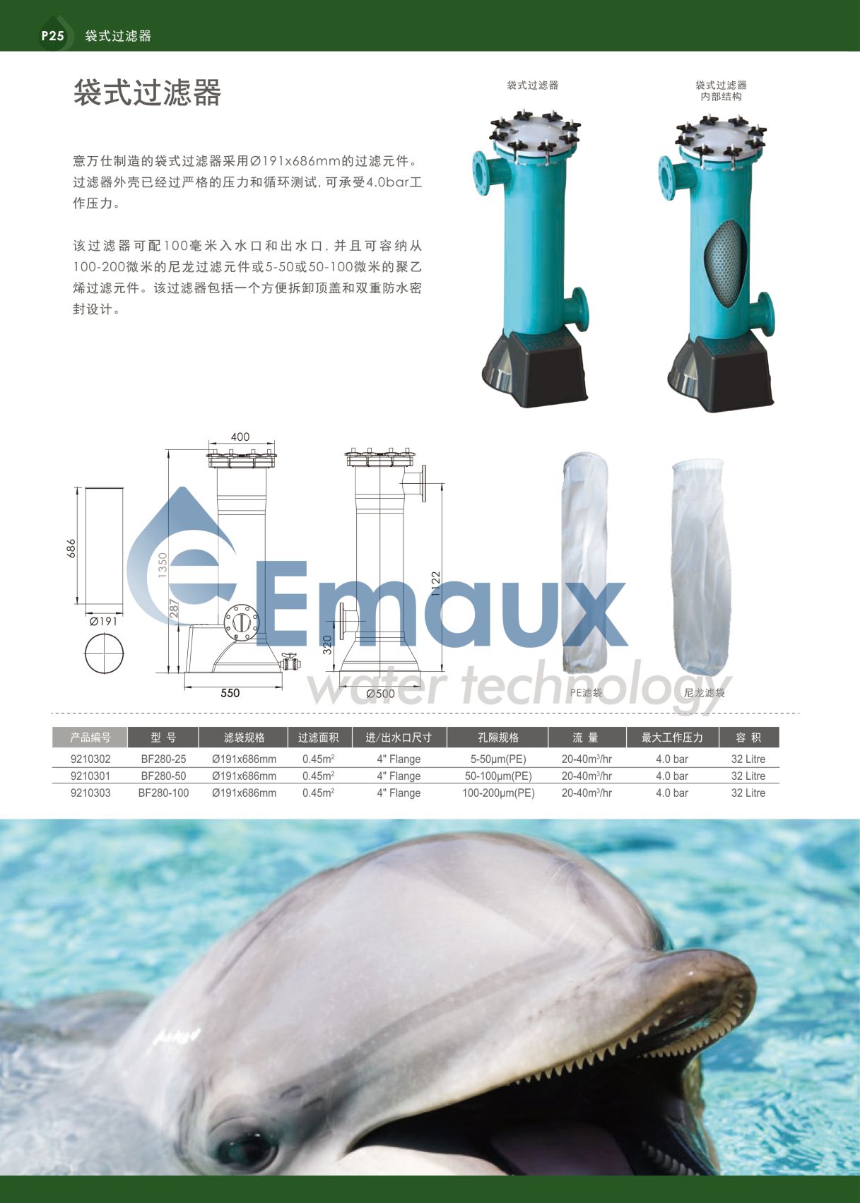 意萬仕制造的袋式過濾器采用0191x686mm的過濾元件。過濾器外殼已經(jīng)過嚴(yán)格的壓力和循環(huán)測試,可承受4.0bar工作壓力。 該過濾器可配100毫米入水口和出水口, 并且可容納從100-200微米的尼龍過濾元件或5-50或50-100微米的聚乙烯過濾元件。該過濾器包括一個(gè)方便拆卸頂蓋和雙重防水密封設(shè)計(jì)。