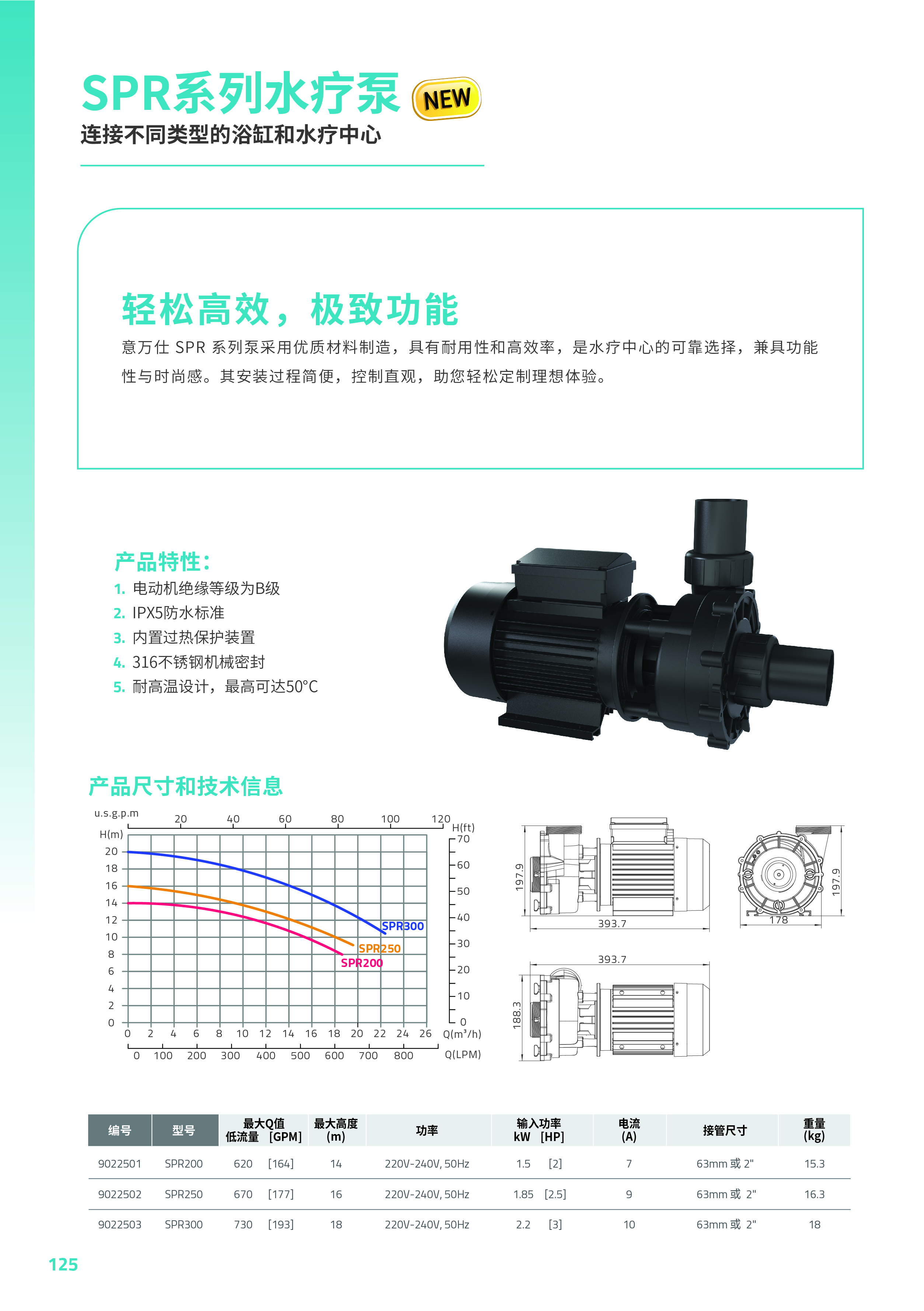 意萬仕 SPR 系列泵采用優(yōu)質(zhì)材料制造,具有耐用性和高效率,是水療中心的可靠選擇,兼具功能 性與時尚感。其安裝過程簡便,控制直觀,助您輕松定制理想體驗。