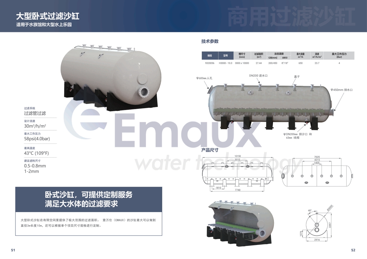 大型臥式沙缸在有限空間里提供了極大范圍的過濾面積。 意萬仕(EMAUX)的沙缸最大可以做到直徑3m長度10m。還可以根據(jù)單個(gè)項(xiàng)目尺寸規(guī)格進(jìn)行定制。