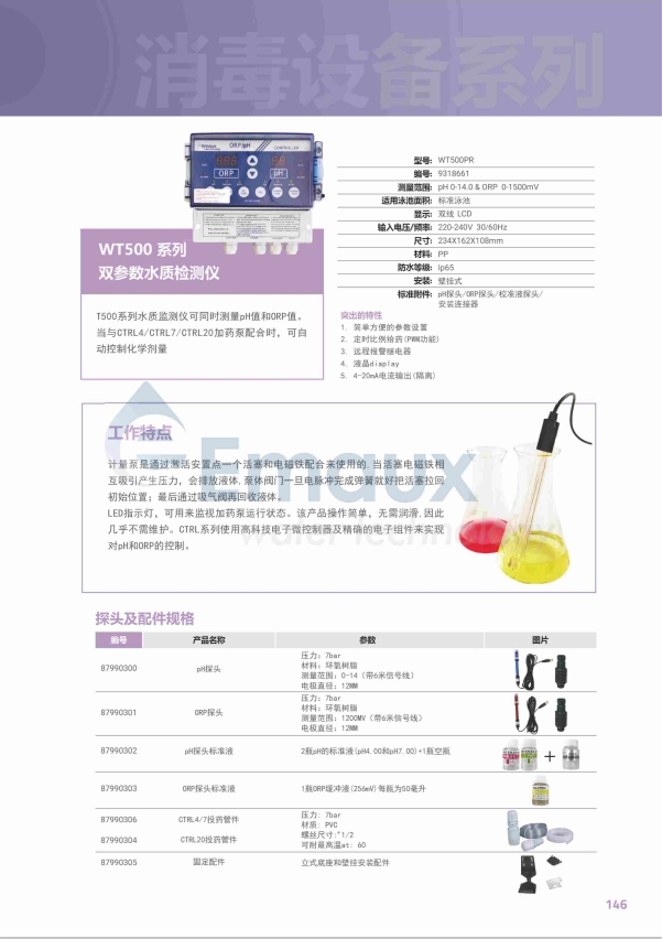 T500系列水質(zhì)監(jiān)測儀可同時測量pH值和ORP值。 當(dāng)與CTRL4/CTRL7/CTRL20加藥泵配合時,可自動控制化學(xué)劑量