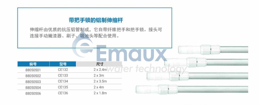 伸縮桿由優(yōu)質(zhì)的抗壓鋁管制成,它自帶纖維把手和把手鎖。接頭可連接手動撇渣器、刷子、吸池頭等配合使用。