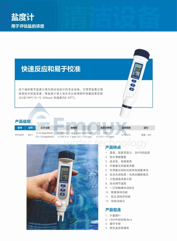 這個(gè)袖珍數(shù)字鹽度計(jì)是為游泳池設(shè)計(jì)的專業(yè)設(shè)備,它使用鹽氯化器檢測(cè)池中的鹽濃度。將鹽度計(jì)浸入池水中以獲得即時(shí)測(cè)量結(jié)果范圍從0至70PPT(O-70,000ppm)和溫度為0-50°C。