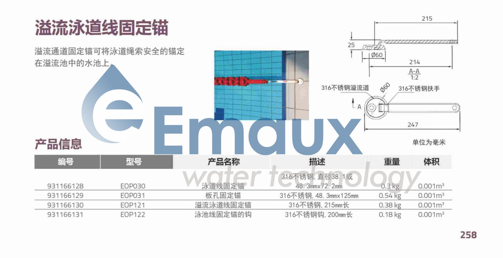 溢流通道固定錨可將泳道繩索安全的錨定 在溢流池中的水池上。